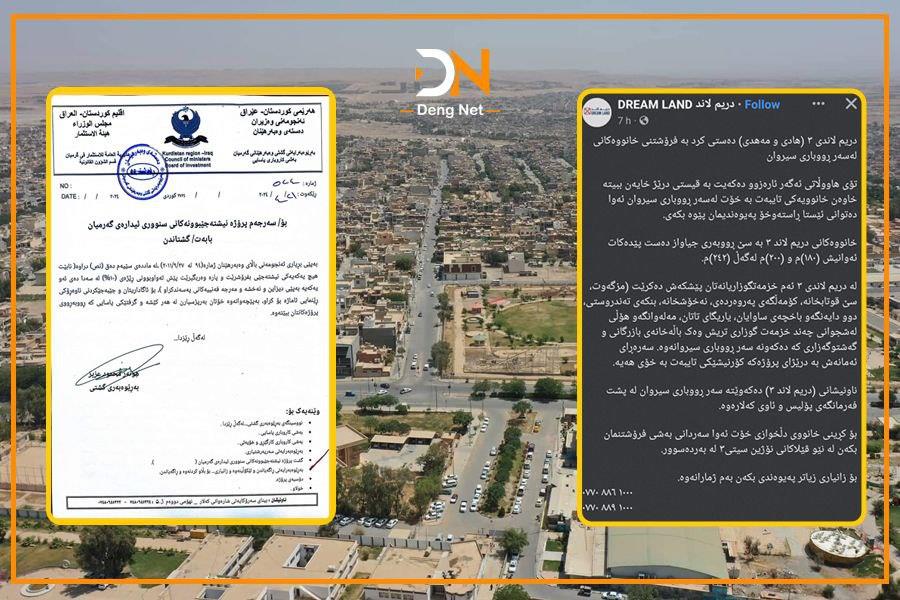 پرۆژەی 'دریم لاند ۳' کە لە رۆخی روباری سیروان دروستدەکرێت، لەئێستادا لەقۆناغی سەرەتایی کارکردنێتی و هێشتا یەکەکانی دروست نەکراوە، بەڵام وەک لە پەیجەکەیانەوە ئەمڕۆ بڵاویانکردوەتەوە، ریکلام و بانگەواز دەکەن بۆ فرۆشتنی یەکەکانیان "هەر لە ئێستاوە".